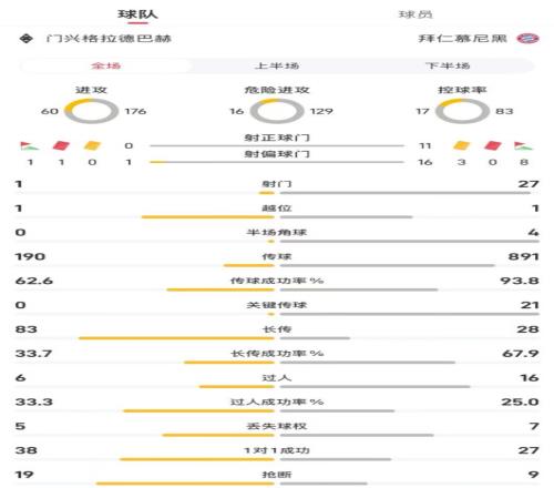 雷速体育10月25日宣 今晚刚刚结束的德甲第九轮的一场焦点战,门兴格拉德巴赫主场迎战拜仁慕尼黑。上半场双方均无建树,下半场基米希帮助拜仁打破僵局,随后格雷罗和卡尔又连下两城,最终拜仁3-0完胜门兴,迎来开赛季各项赛事13连胜。