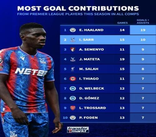 11月7日宣 德国转会市场统计了英超球员本赛季各赛事的参与进球数量,并列出榜单,哈兰德参与19球居首,萨尔参与10球次席。