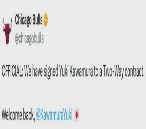 据名记Scotto报道,河村勇辉将与公牛重新签下一份双向合同。该消息已经得到了公牛官方的确认。